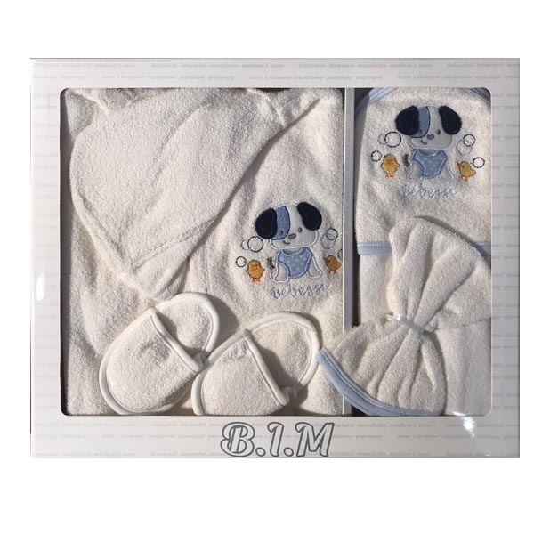 ست حولهی «B.I.M» برای ردهی سنی نوزادی تا دو سالگی در نظر گرفته شده است. این مجموعه دارای پنج تکه از ملزومات ضروری بهداشت و حمام نوزادان است . این ست شامل تن پوش ، حوله کلاه دار ، لیف ، پاپوش و حوله دست و صورت می باشد و قابل شستشو با دست و ماشین است که از جنس پنبه با پرزهای کوتاه و جذب رطوبت بالا ساخته شدهاند. که دارای پرز ها کوتاه و قابلیت جذب رطوبت بالا بوده و ضد حساسیت می باشد