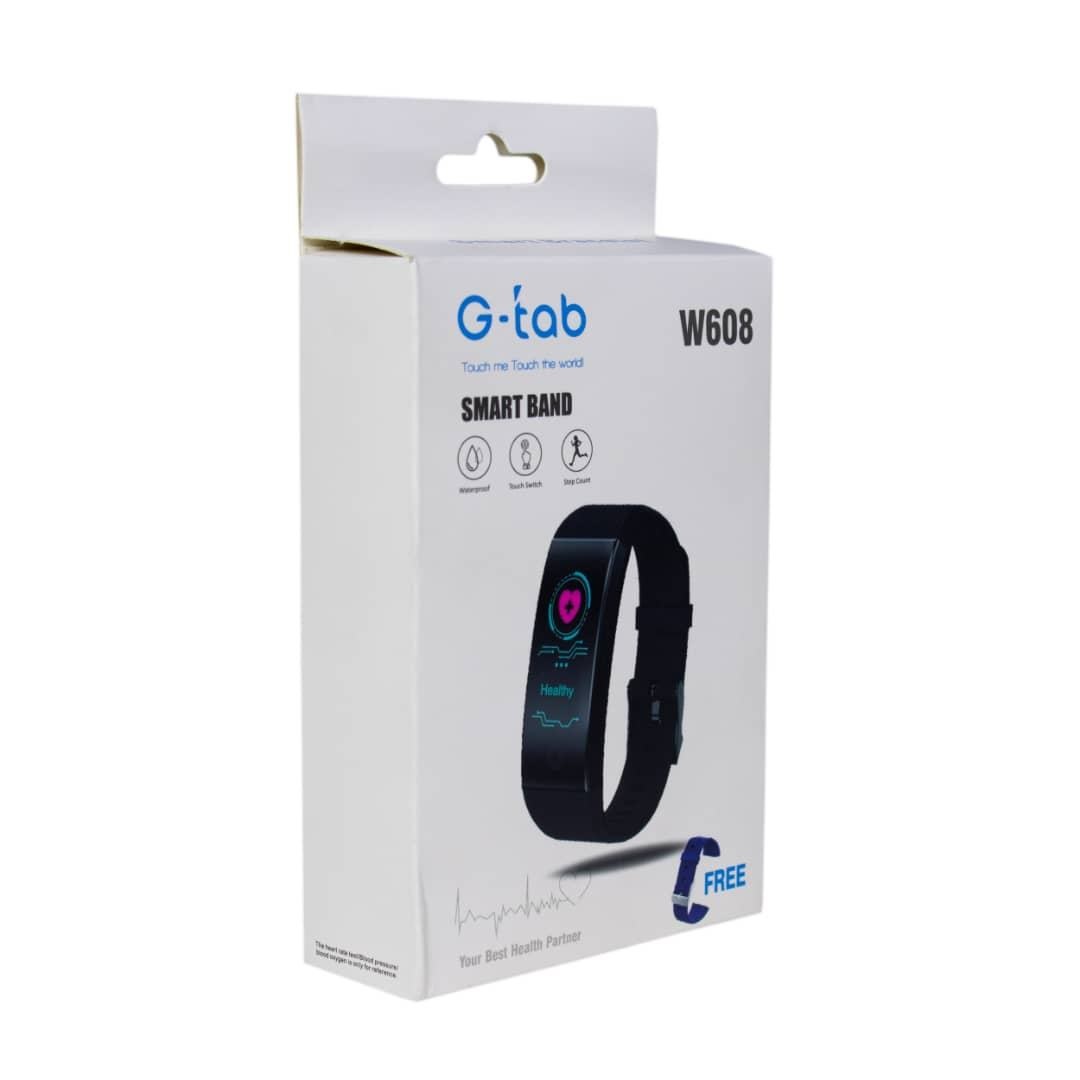این مچ بند هوشمند از یک صفحه نمایش ۰.۹۶ اینچی TFT با رزولوشن ۱۲۰ × ۲۴۰ پیکسل بهره می برد. ابعاد این مچ بند هوشمند برابر با ۴۳ × ۱۷.۲ × ۱۱.۵ میلیمتر می باشد و تنها ۲۰ گرم وزن دارد. G TAB W608 از بلوتوث نسخه ۵.۰ و سیستم عامل اختصاصی خود بهره می برد. این مچ بند هوشمند با تمام دستگاه های دارای سیستم عامل اندروید نسخه ۴.۴ و iOS نسخه ۹.۰ و بالاتر سازگار است. با اتصال این مچ بند به گوشی هوشمند یا تبلت خود می توانید اعلان های شبکه های اجتماعی و تماس های دریافتی خود را بر روی آن مشاهده نمایید. لازم به ذکر است که این مچ بند هوشمند از زبان فارسی نیز پشتیبانی کرده و تا ۴۵ کاراکتر را به شما نمایش می دهد. GTAB W608دارای سنسور ضربان قلب با دقتی بیش از ۹۴ درصد می باشد. شتاب سنج ۶ محوره، گام شمار، پایش خواب و مادون قرمز از دیگر سنسور های این مچ بند هوشمند به شمار می رود. شما می توانید با نصب برنامه مچ بند با اسکن کردن کد ۲ بعدی پشت جعبه روی گوشی خود از تعداد قدم های برداشته شده، میزان کالری مصرف شده و همچنین وضعیت خواب خود مطلع شوید. علاوه بر موارد ذکر شده، این اپلییکیشن می تواند در جهت پیشبرد اهداف ورزشی شما برنامه هایی را ارائه نماید. GTAB W608 همچنین بر اساس گواهینامه های دریافتی، می تواند تا عمق ۱ متری در آب شناور شده و بدون هیچ مشکلی به فعالیت ادامه دهد. باتری در نظر گرفته شده برای این مچ بند هوشمند از نوع لیتیوم پلیمیری بوده و ظرفیت آن برابر با ۹۰ میلی آمپر ساعت می باشد. بر اساس اعلام GTAB W608 می تواند با یک بار شارژ کامل تا ۲۰ روز در حالت استندبای و ۴ روز درحالت استفاده استاندارد شارژدهی داشته باشد.