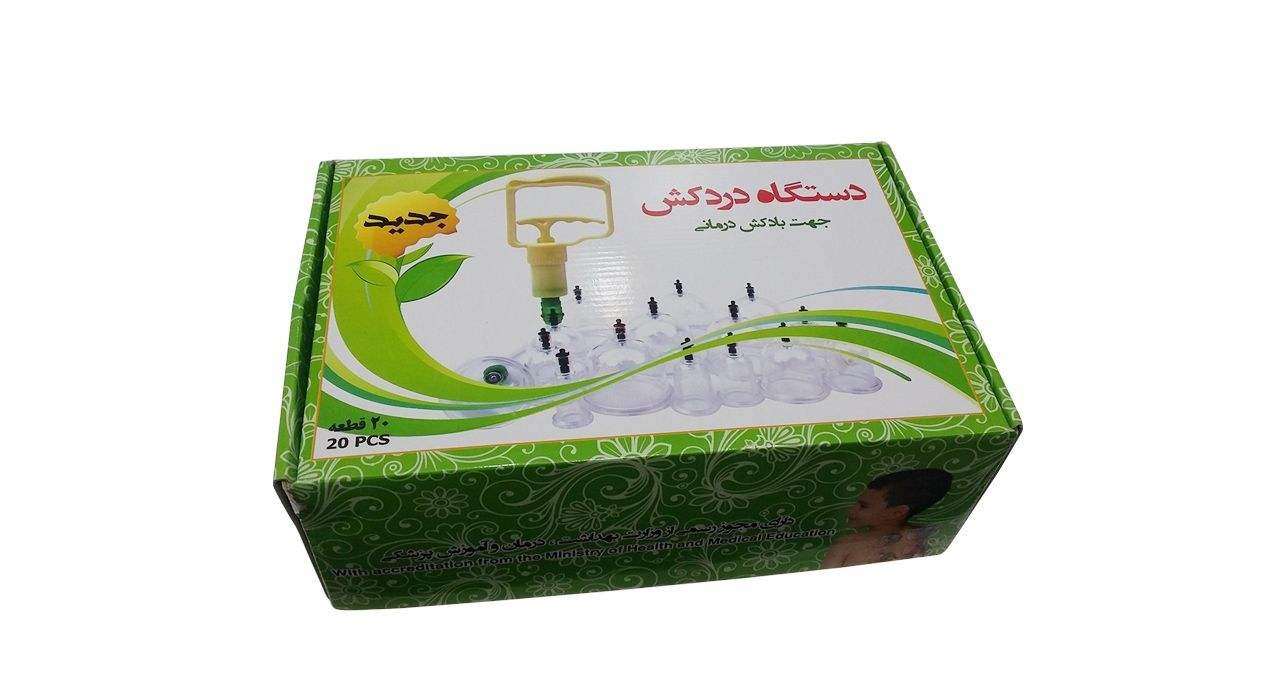 | سایر ویژگی ها | دارای 16 لیوان با اندازه های مختلف, دارای دسته بادکش با کاربری بسیار راحت, برگه راهنما کاربرد اجزای مختلف بدن رفع دردهای زانو، ساق پا، پاشنه، کف و روی پا, رفع گرفتگی و اسپاسم های عضلانی, کمک به درمان برخی از اختلالات قاعدگی, کمک به رفع درد های قاعدگی, تخلیه سموم ناشی از گزیدگی, کمک به درمان زخم بستر, رفع درد های ناشی از ترک اعتیاد |