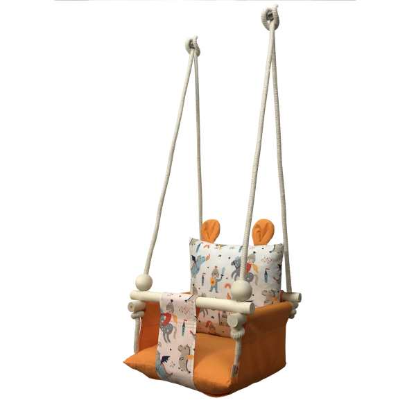 این تاب کودک از چوب طبیعی و پارچه کتان ضد حساسیت (تمام نخ) ساخته شده است. بدنهی پارچهای و کوسنهای این تاب قابلیت شستشو با ماشین لباسشویی (با دور کم) را داراست. برای کودکان تا ۳۰ کیلوگرم مناسب است و به راحتی قابلیت آویزان کردن از بارفیکس، سقف منزل، چارچوب در و شاخهی درخت را دارد. در بستهی این محصول ۴ عدد استوانهی چوبی بسیار مستحکم از مغز تنهی درخت و ۲ عدد توپ چوبی زیبا و ۷متر و نیم طناب پنبه ای ضخیم که در عین نرم بودن برای کودکان تحمل وزن بالایی دارد، قرار داده شده است. سر هم کردن این تاب بسیار ساده است و تنها با عبور دادن طناب از سوراخ چوبها مطابق عکس انجام می شود. این تاب به راحتی از بارفیکس آویزان می شود و در صورت استحکام سقف اتاق می توان از سقف نیز آن را آویزان نمود. فضای نشیمن کودک داخل تاب حدود ۳۸ سانت در ۳۸ سانت است که برای اکثر کودکان تا سن ۸ سالگی کافی است.