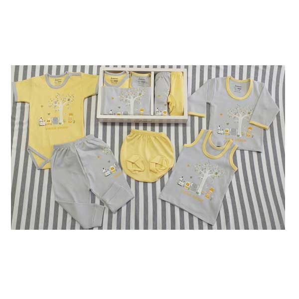 انتخاب ست لباس نوزاد، خصوصا به والدینی که اولین تجربه بچه دار شدن را دارند، توصیه می شود؛ زیرا با خرید این ست، انواع مختلفی از البسه مورد نیاز نوزاد در یک پکیج تهیه می شود. این ست ها شامل البسه مورد استفاده روزمره نوزادان در ۴ فصل سال می باشند که شامل: تیشرت آستین بلند، زیر دکمه دار آستین کوتاه، رکابی، شلوار و شورت است. هنگام خرید لباس نوزادی باید از با کیفیت بودن آن اطمینان حاصل کنید. پوست کودک حساس است و لباسهایش باید از بهترین مواد تهیه شده باشند. این ست ها از الیاف تمام نخ تهیه شده است. نخ هنوز محبوبترین الیاف لباس کودک است زیرا کمترین درصد مواد مضر را در خود دارد.ین ست ها از آن جهت که یقه گرد میباشد و دوخت ساده بدون زیپ ، بند و اقلام دست پا گیر دارند حس راحتی را به کودک شما میدهد. کش به کار رفته در کمر شورت و شلوار بسیار نرم بوده و راحتی هرچه تمامتر را برای نوزاد به ارمغان میآورد. جهت نگهداری بهتر از این محصول، از سفید کننده استفاده نشود و با رنگ های مشابه خود شست و شو شود. برای شست و شوی لباس نوزاد هرگز از شوینده های قوی و یا عطر دار استفاده نکنید. این کار موجب می شود احتمال بروز حساسیت در پوست نوزاد افزایش پیدا کند دمای شستشو لباسها ۳۰ درجه سانتی گراد است.
