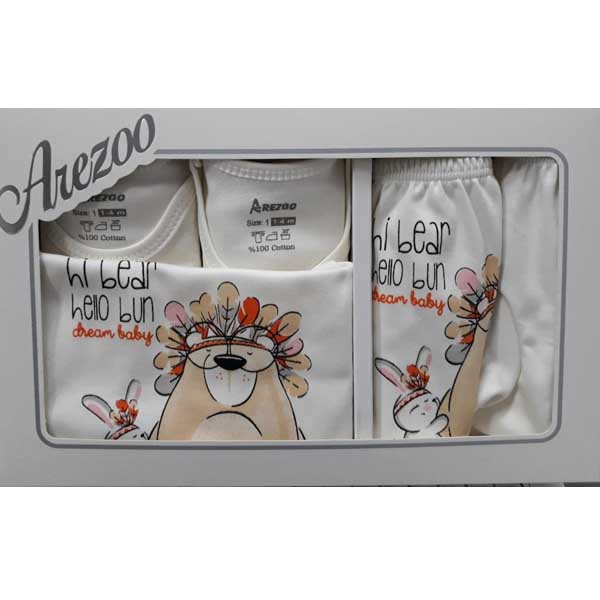 ست لباس نوزادی برند «آرزو» یک ست تقریبا کامل از لباسهایی است که ابتدای تولد نوزاد مورد استفاده قرار میگیرند. در این ست یک رکابی، یک زیر دکمه دارآستینکوتاه،یک بلوز آستین بلند، یک شلوار کمرکشی و یک شورت عینکی ارائه شده است.