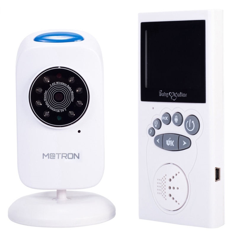 دوربین و پیجر تصویری ماترون مدل baby monitor از نسل چهارم محصولات شرکت ماترون است که دوربین برای مراقبت دائمی از فرزند دلبند شما به همراه مانیتور عرضه می گردد.مانیتور همراه دوربین قابل شارژ بوده و با پایه ای که پشت آن نصب شده می توانید آن را به حالت ایستاده قرار دهید.کیفیت بالای مانیتور و دوربین و همچنین زاویه ی باز لنز آن یک محدوده ی دید گسترده و با کیفیت در اختیار شما قرار می دهد. دوربین قابلیت پخش دو طرفه ی صدا را دارد تا هم صدای داخل اتاق نوزاد را بشنوید و هم صدای خودتان را در اتاق کودک پخش کنید. همچنین در صورت لزوم با فشردن یک دکمه، دوربین شروع به پخش موزیک آرام و لطیفی در فضای اتاق کودک می کند . سنسور دماسنج متصل به دوربین به صورت لحظه ای دمای اتاق کودک را بر روی مانیتور نشان می دهد. شما می توانید در تمام طول روز و شب با کمک سیستم دید در شب تصویر و صدای واضح و گویا از شرایط نوازدتان داشته باشید. دوربین دارای حالت چراغ خواب بوده و در صورت تمایل نور بسیار ملایمی برای محیط ایجاد می کند.